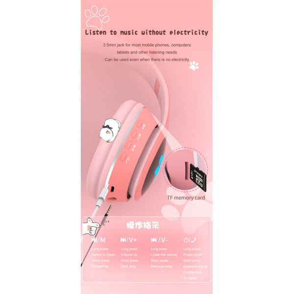 5. Cute Cat Ear with LED Lights - Bluetooth headphones features with a lovely cat ear design and fancy LED lights. Built-in 400mAh rechargeable battery can realize about 9hrs of playing with LED lights. Ideal Christmas/Birthday gift for family and friends, suitable for office work/sport/school/traveling, etc.
